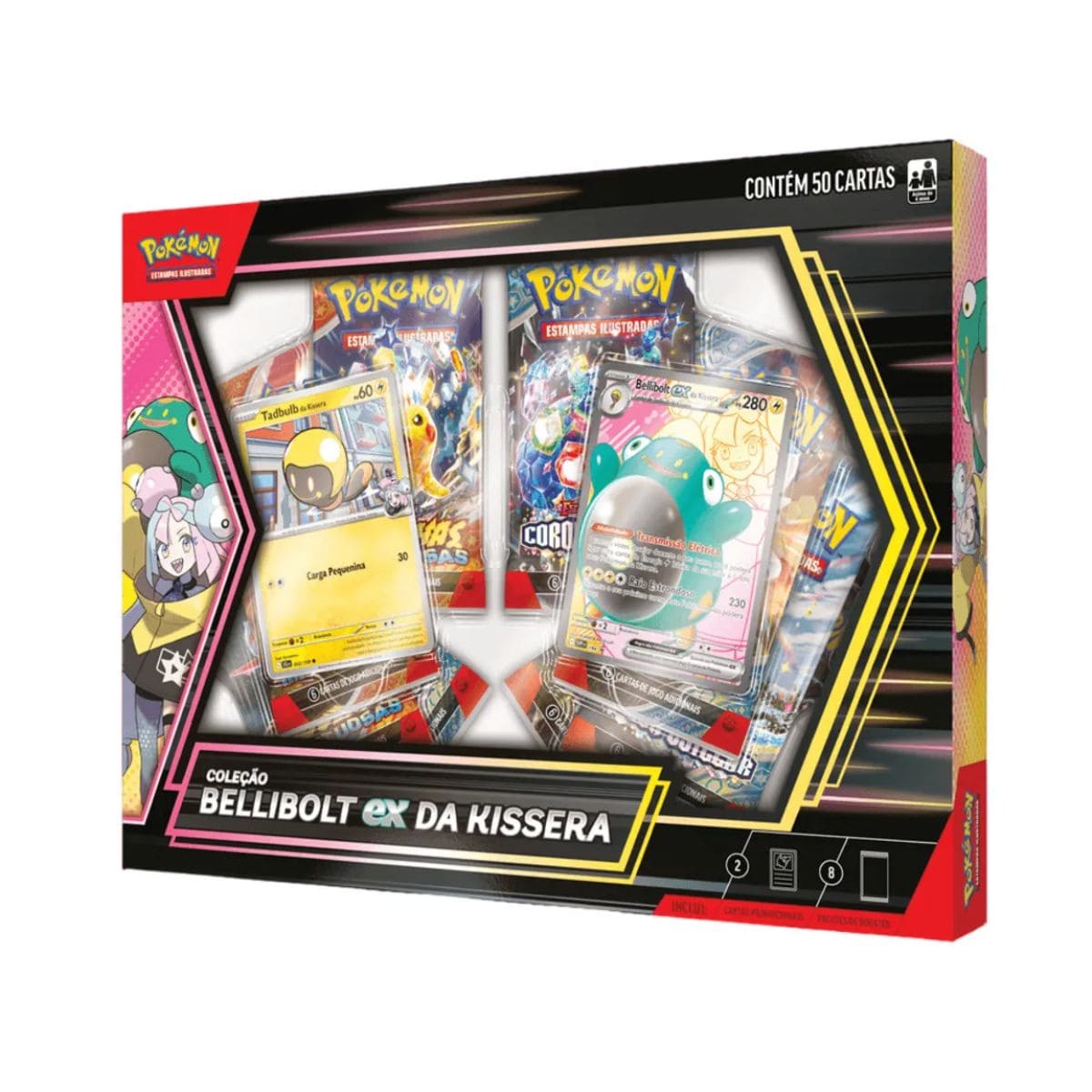 A coleção inclui uma carta holográfica promocional do Bellibolt ex da Kissera, uma carta holográfica de Tadbulb, e nada menos que 8 pacotes de booster do Pokémon Estampas Ilustradas — oferecendo cartas sortidas para fortalecer seu baralho e turbinar sua coleção com surpresas.