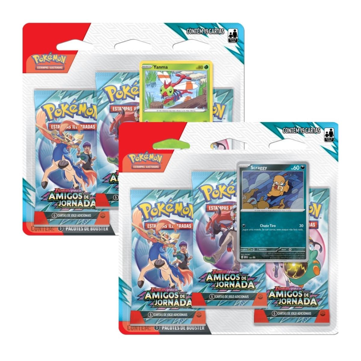 Prepare-se para uma jornada épica no mundo de Pokémon Estampas Ilustradas com o Kit 2 Blister Triplo Escarlate e Violeta – Amigos de Jornada com Yanma e Scraggy!