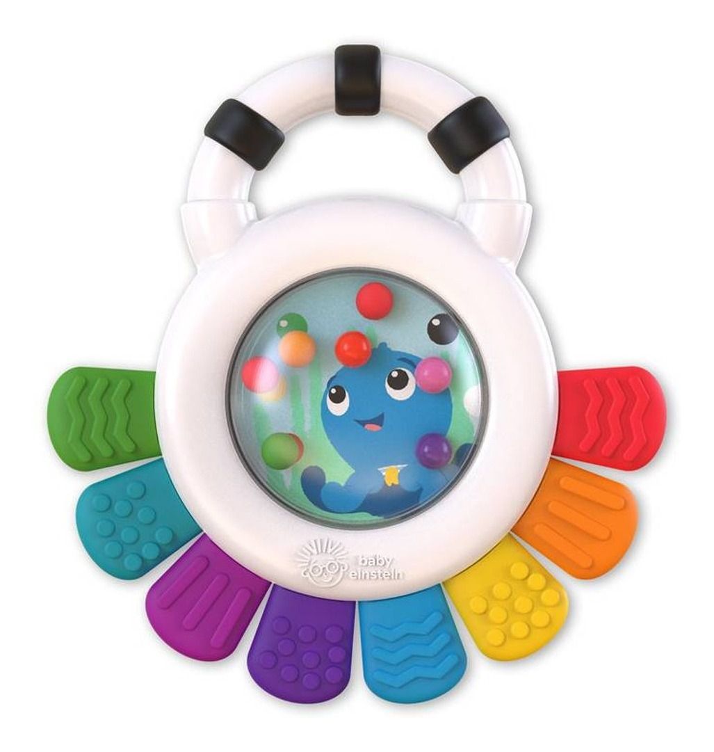 Um mordedor multissensorial sendo capaz de promover a visão, o som e o envolvimento do toque com chocalhos de cores vivas e 8 texturas palpáveis e dentáveis
