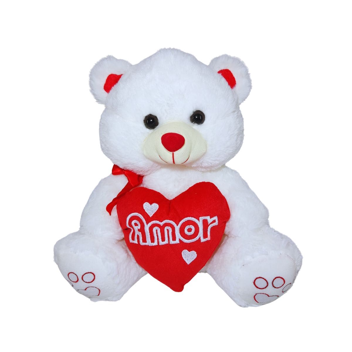 Detalhes: Laço de cetim vermelho, nariz em formato de coração, patas bordadas