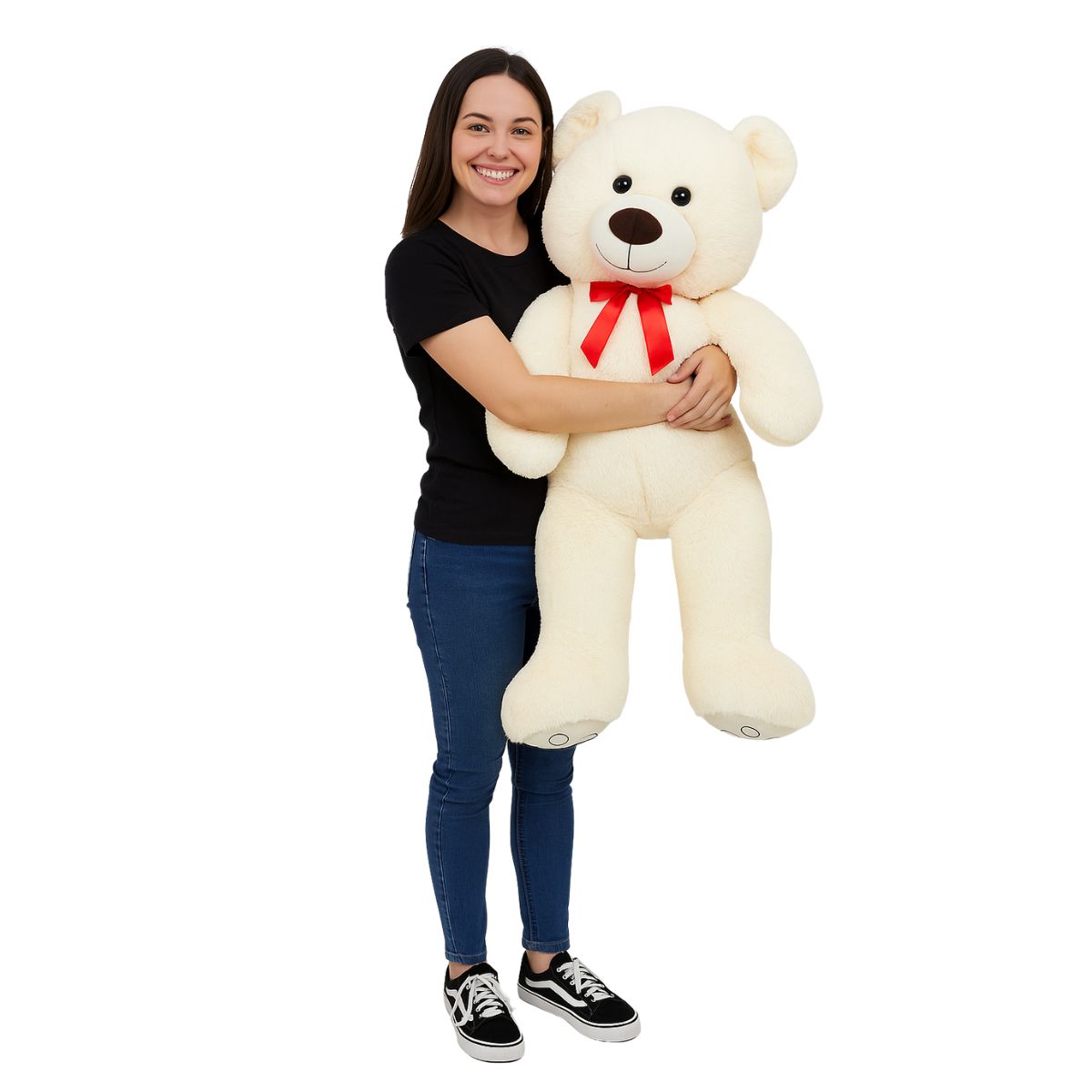O Urso de Pelúcia Grande Fizzy Toys Cor Creme é pura doçura em forma de abraço. Com 105 cm de altura, pelagem macia e laço vermelho vibrante, ele transmite ternura e elegância em cada detalhe.